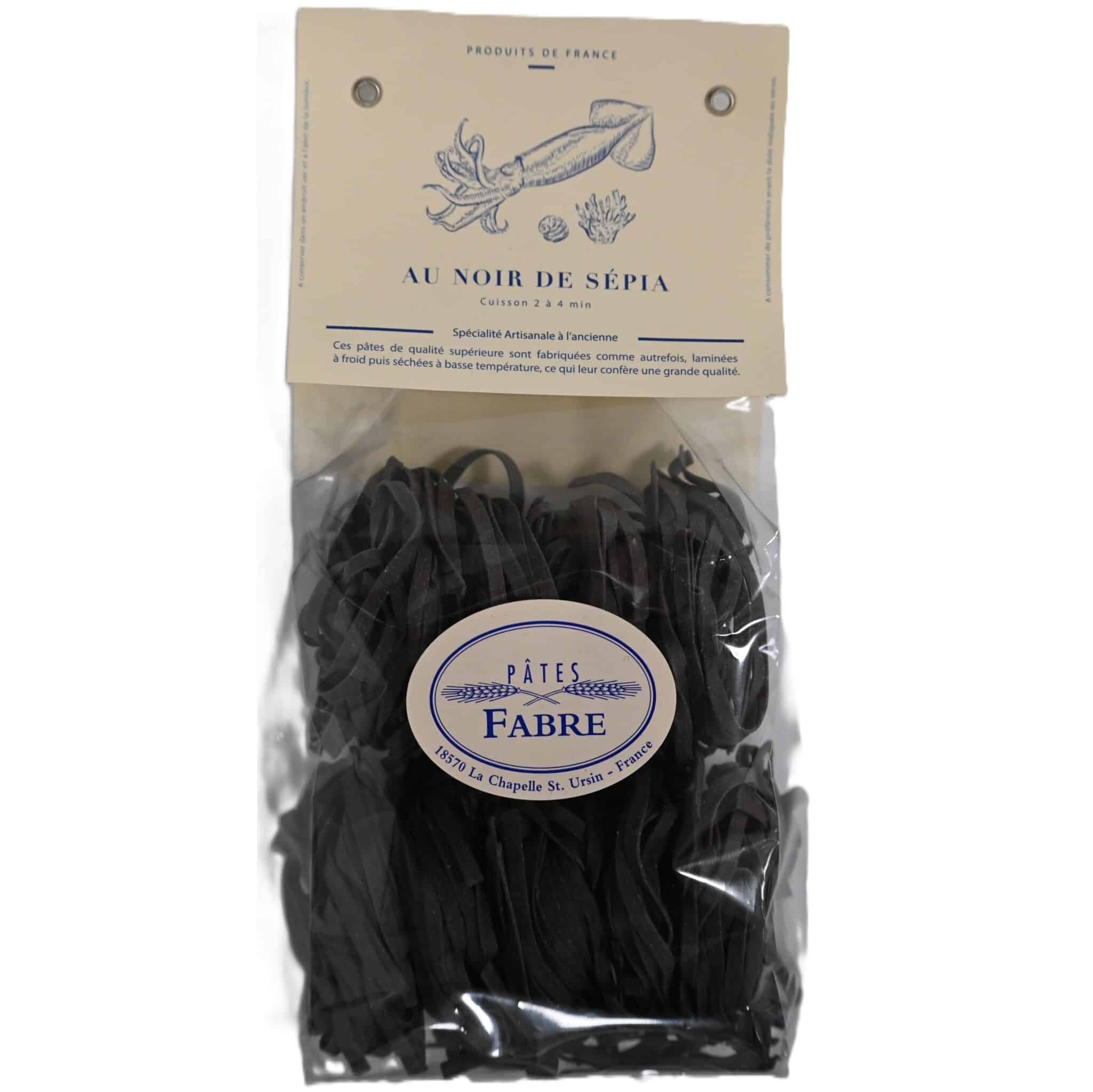 Blæksprutteblækpasta fra Pâtes Fabre – Håndlavet fransk pasta tilsat naturligt blæksprutteblæk, der giver en dyb farve og delikat havsmag. Ideel til fisk og skaldyr.
